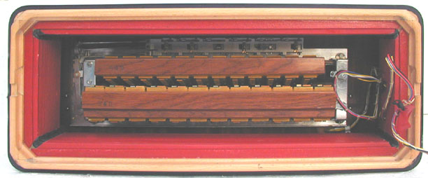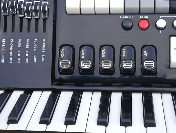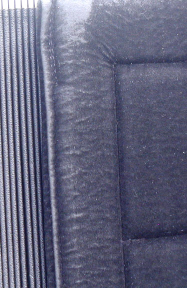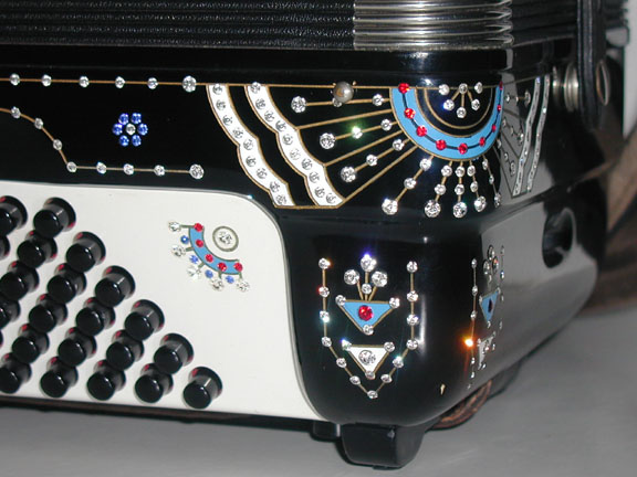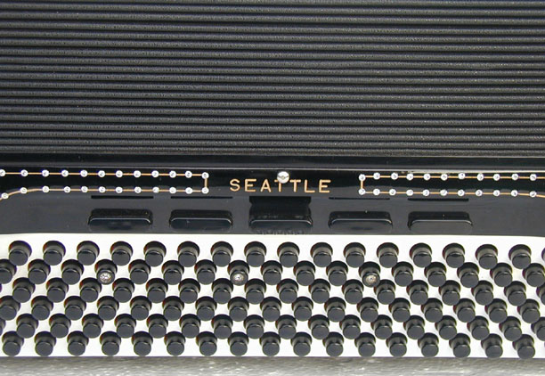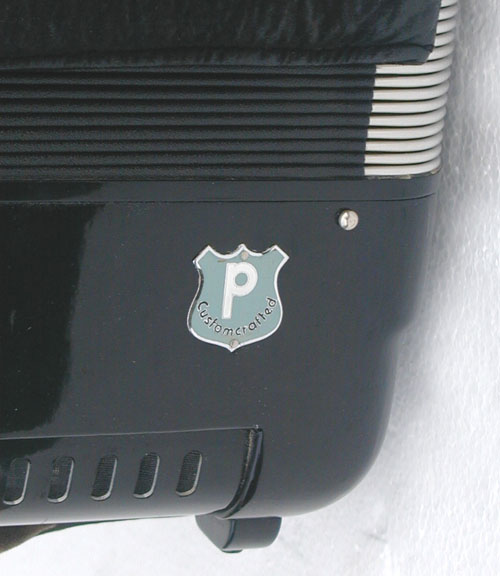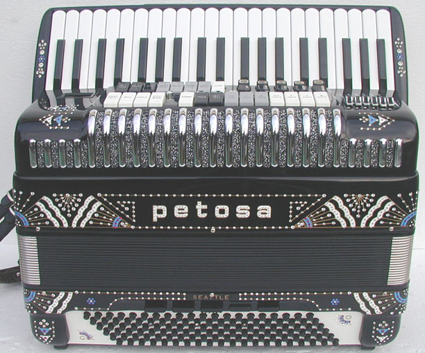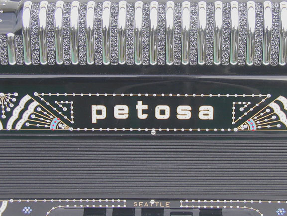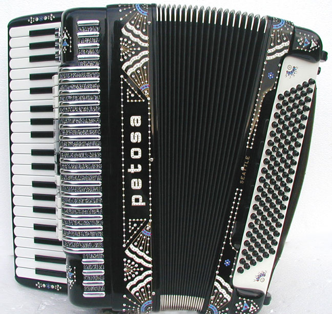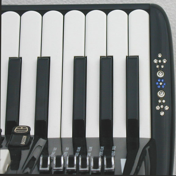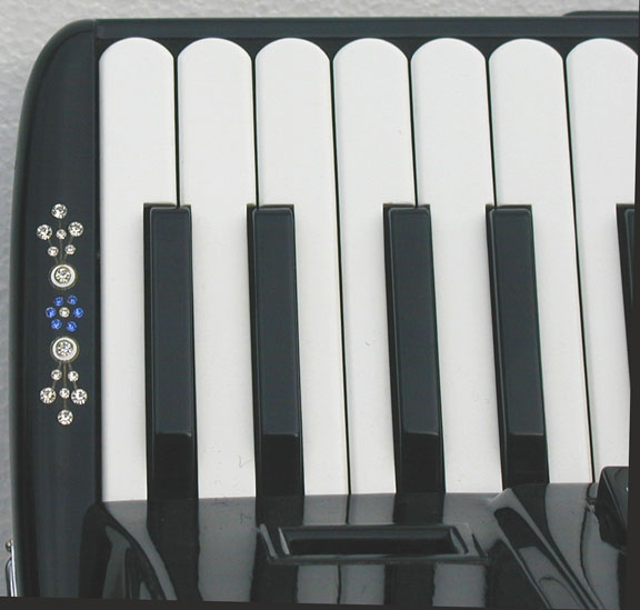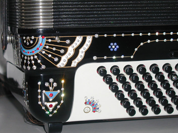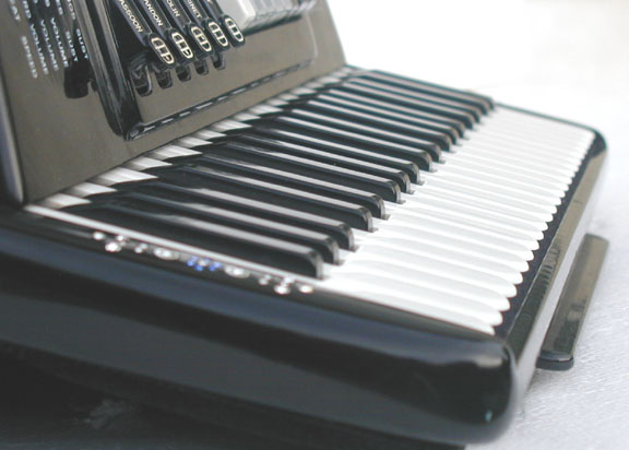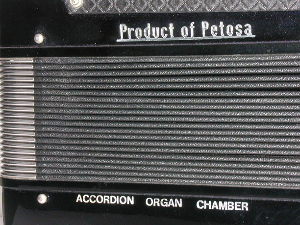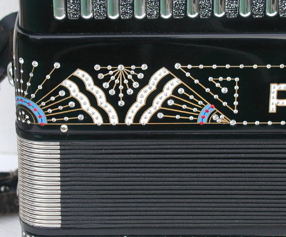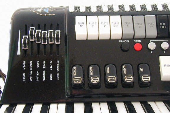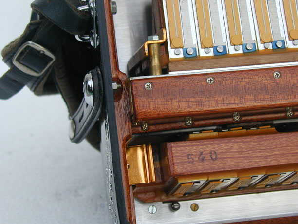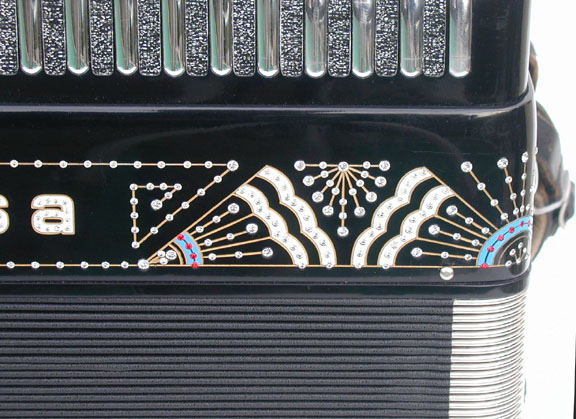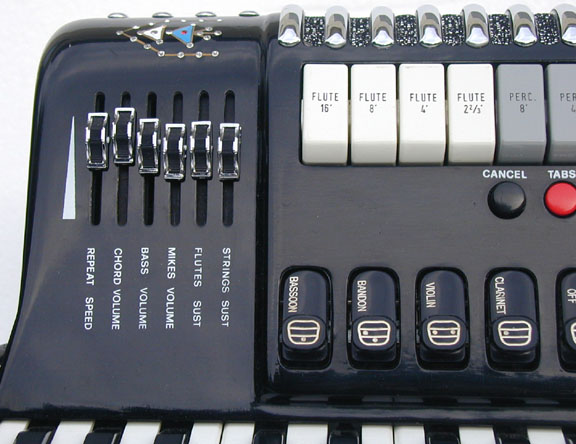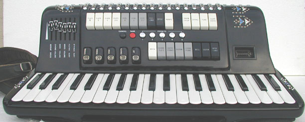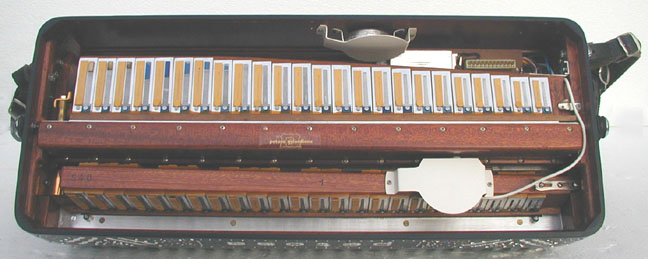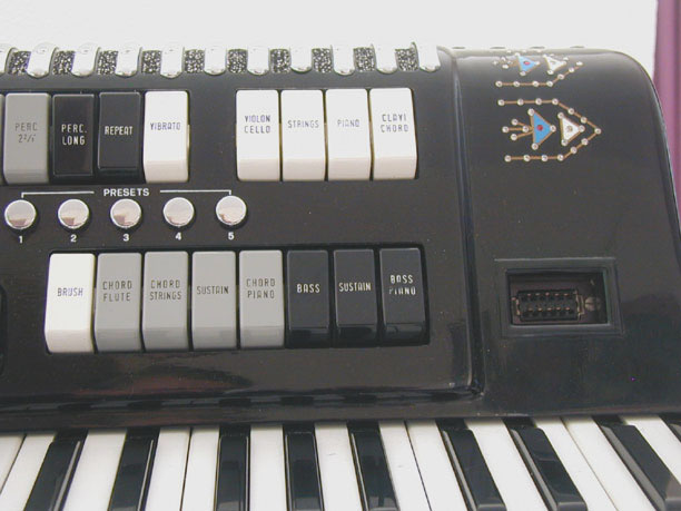 The instrument has three sets of treble reeds and four sets of bass reeds. Of the treble reeds, there are two in the tone chamber, the Low (bassoon) reeds and the Middle (Clarinet) reeds. It is a full size 41 key, 120 bass accordion; the dimension of the keyboard is 19 1/4 inches across the keys. The keyboard is "fast". The reeds are hearty; acoustically, the accordion "barks" (can be played loudly) with no evidence of choking. Bellows are in excellent condition and provide firm compression. There is no evidence of mildew or musty smell. The accordion has two microphones; the microphone volume control is provided on the control panel (see photos). The accordion can be played with an external generator tailored for this instrument. The possible electronic sounds are implied by the photos of the control panel. On the treble side, selections include: 5 presets, organ / flute sounds, piano, clavichord, violin cello, strings. For the bass side, the chord selections include, piano, flute, strings, with a brush effect. The bass/ counter-bass selections allow either (string) bass or piano. External generators which are available come with or without a MIDI output port. With the MIDI output port additional synthesizers/ arrangers can be controlled. Also available is an external interface module, made by ELKA, EK2000, with a MIDI output. When connected to this accordion, the EK2000 external module allows the control of MIDI controlled synthesizers/ arrangers. The EK2000 is the size of a large brick. The electronic generators can be played with or without the acoustic accordion. Conversely the acoustic accordion can be played with or without the electronic generators. Many photos, taken in November 2006, are provided below to show details of the instrument. The photos of the reeds/ leathers show that they are in excellent condition. The beautiful decor of the instrument is obvious from the photos. The accordion straps, bellows protection pad and the bass strap are in good to excellent condition. The bellows retention straps are made of leather and are in excellent condition. The quality of the bellows protection pad can be observed in a photo below. Summary information about the accordion: Weight: 30 pounds Full 41 key treble keyboard Three Sets of Treble Reeds consisting of one